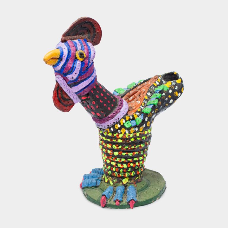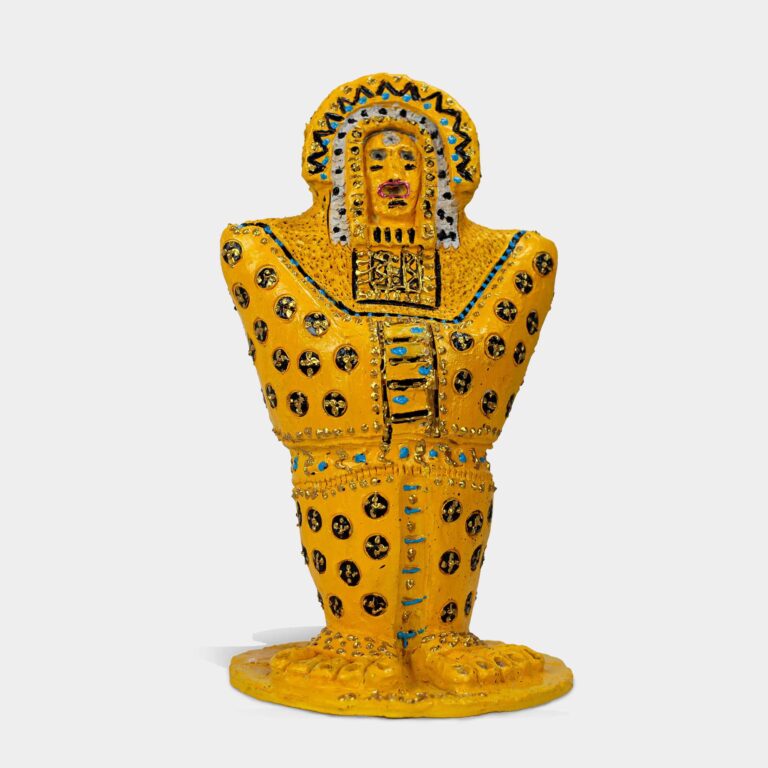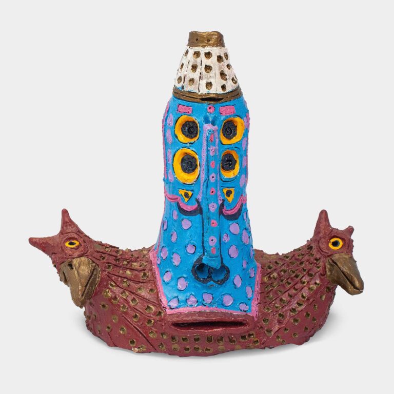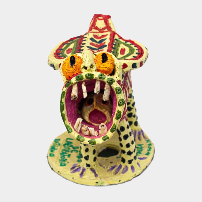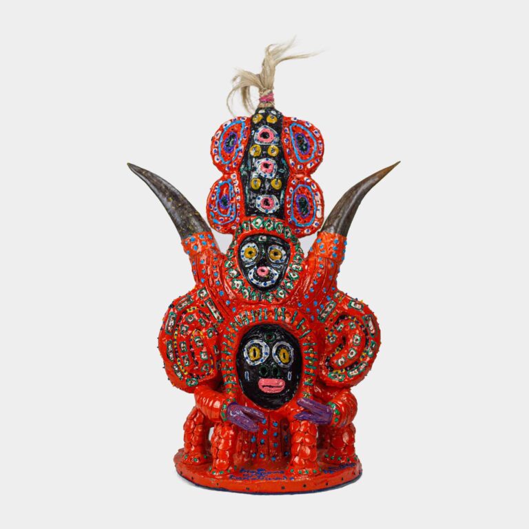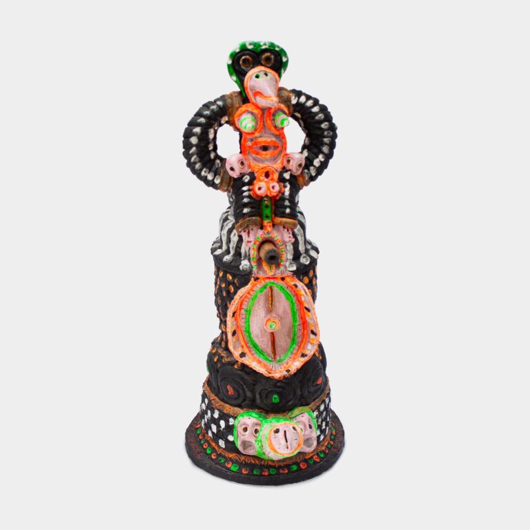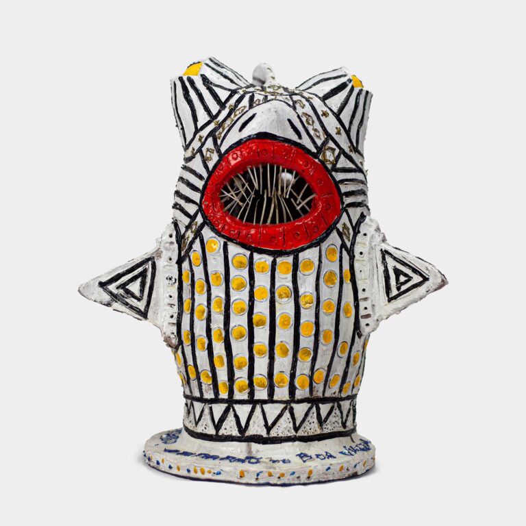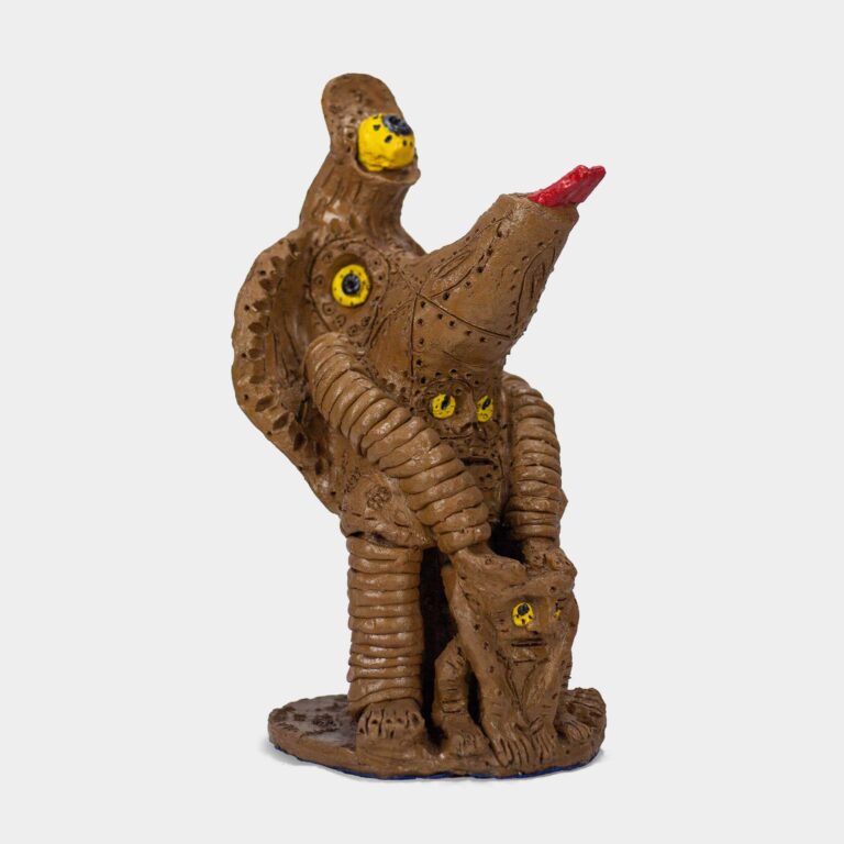 Escultura em cerâmica, acrílica, madeira e sisal.