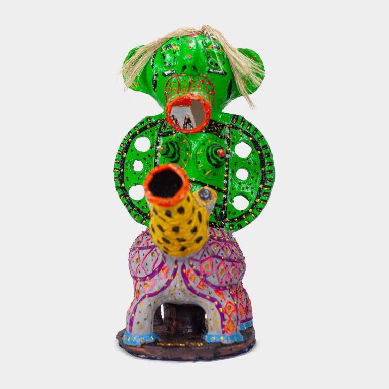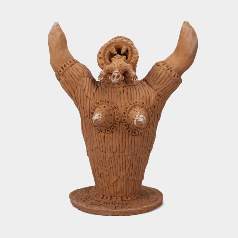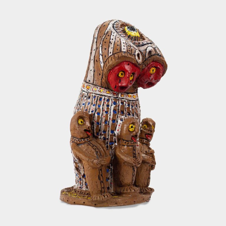 Escultura em cerâmica, acrílica, palha,madeira e dente de bode.