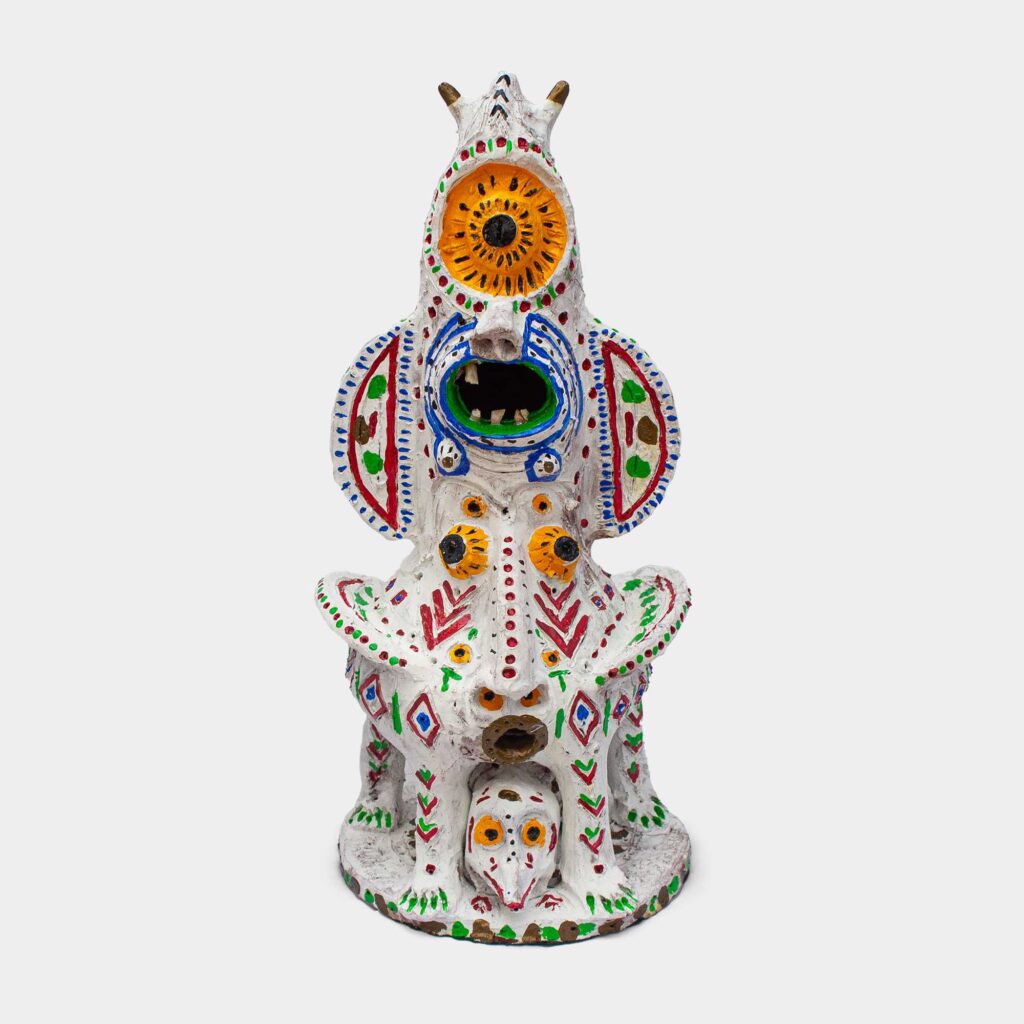 Escultura em cerâmica, acrílica e dente de bode
